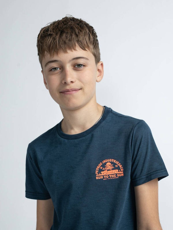 T-SHIRT MET PRINT OP DE BORST EN BACKPRINT BLAUW